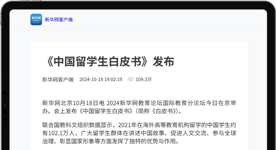 新華網(wǎng)發(fā)布《中國(guó)留學(xué)生白皮書》,瀏覽量突破百萬,獲各大媒體轉(zhuǎn)載熱追。