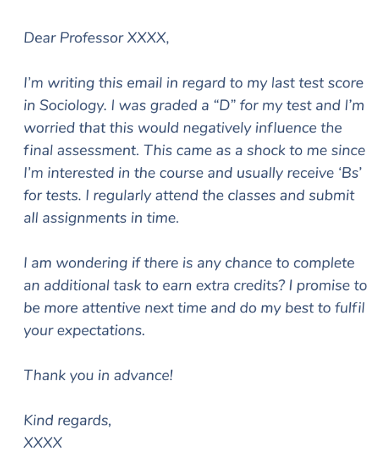 每封郵件的目的略有不同,因此你應該在信的開頭明確說明目標。確保你以禮貌的方式向教授發(fā)送請求的電子郵件。證明需要更好的成績,并解釋它如何影響你的GPA。提到你已經(jīng)意識到自己的錯誤,將會在下次盡力而為。讓教授知道這背后有一些充分的理由。但不要讓它聽起來像借口。要明確表明你是一名認真的學生,給教授發(fā)送最終成績的郵件對你來說并不是常事。