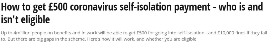 除了重罰,英國政府也對需要自我隔離的人拋出了甜頭。只要符合條件,需要自我隔離的人可以領(lǐng)到500英鎊補(bǔ)助。