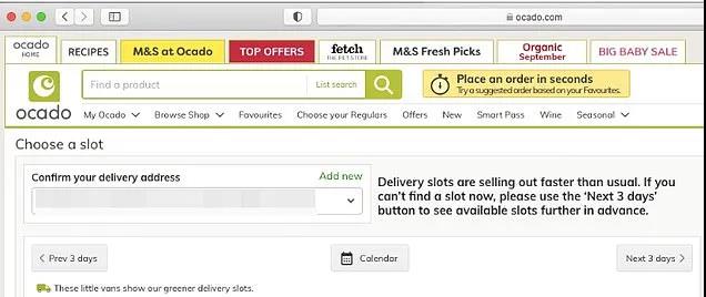 Tesco,Sainsburys'和Ocado已經(jīng)表示,很多客人已經(jīng)很難約上三天之內(nèi)的送貨時(shí)段了。