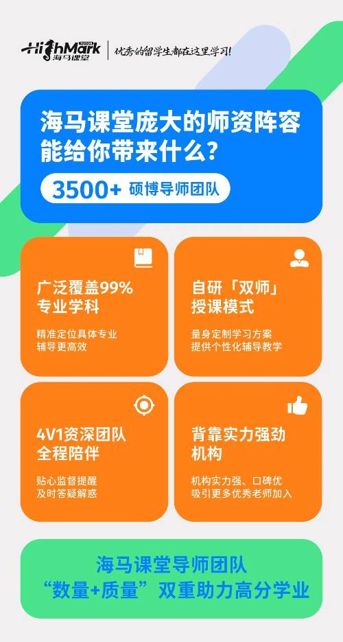 海馬課堂專注于提供卓越的留學(xué)生課程輔導(dǎo)服務(wù),幫助學(xué)生在各個(gè)學(xué)科上蓬勃發(fā)展。通過定制化的輔導(dǎo)方案和專業(yè)團(tuán)隊(duì)的支持,學(xué)生們能夠在復(fù)雜的學(xué)術(shù)環(huán)境中游刃有余。讓海馬課堂成為你留學(xué)旅程中的堅(jiān)實(shí)伙伴,一起創(chuàng)造輝煌的學(xué)術(shù)成就!