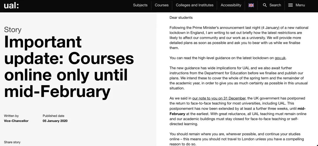 UAL表示,2月中旬之前,大學(xué)只會進行線上教學(xué)。