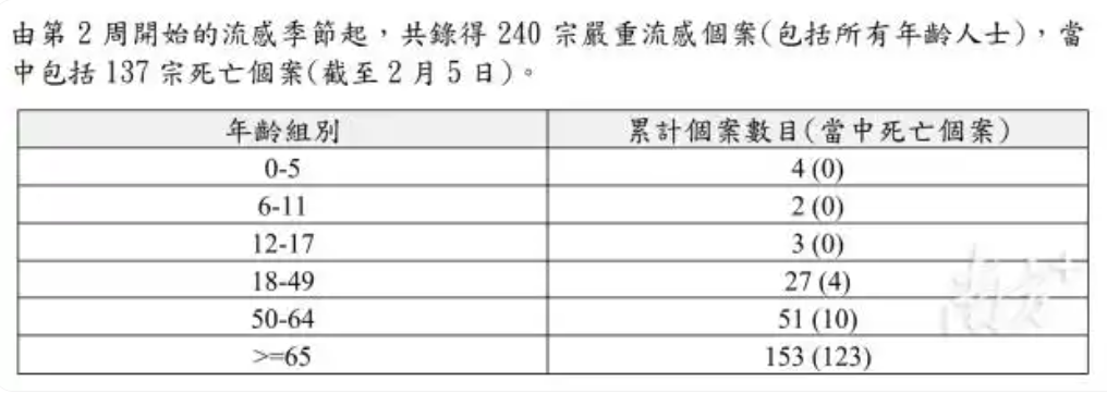 數(shù)據(jù)顯示,自1月5日至2月5日,香港累計(jì)240宗嚴(yán)重流感個(gè)案,其中死亡個(gè)案多集中在老年人群體。65歲以上的死亡個(gè)案占123宗,而在有臨床資料的成人死亡個(gè)案中,約81%的患者本身患有慢性疾病。