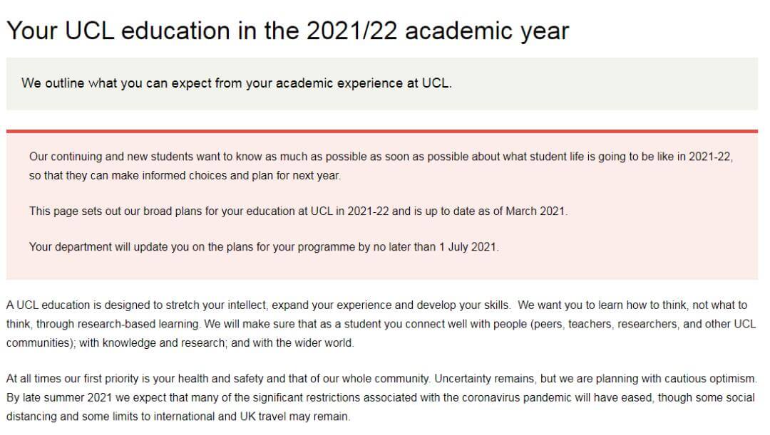 倫敦大學(xué)學(xué)院在2021年的秋季開(kāi)學(xué)計(jì)劃中,更多開(kāi)學(xué)細(xì)節(jié)將在2021年7月1日之前更新。