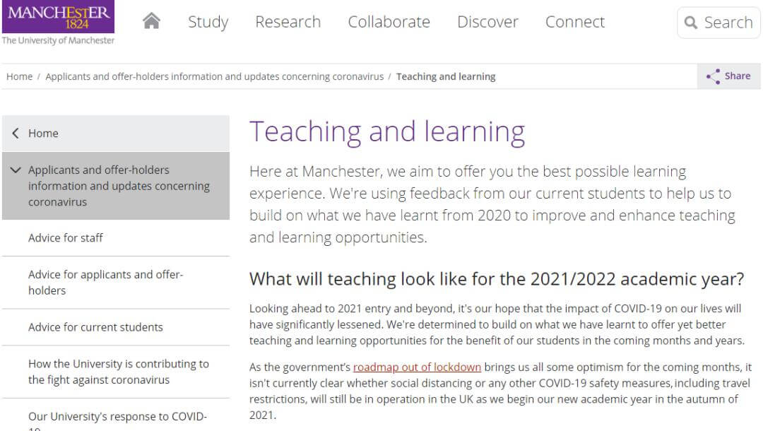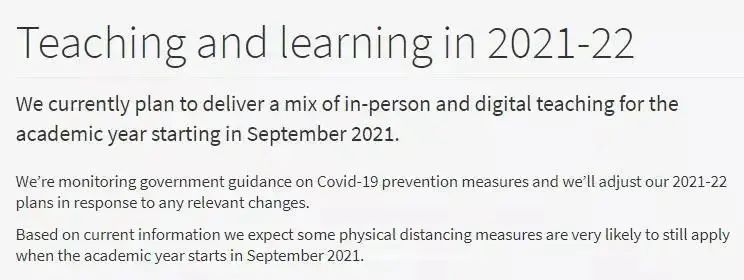 在利茲大學(xué)公布的2021年9月計(jì)劃中,依然采用線上-線下結(jié)合的教學(xué)安排。