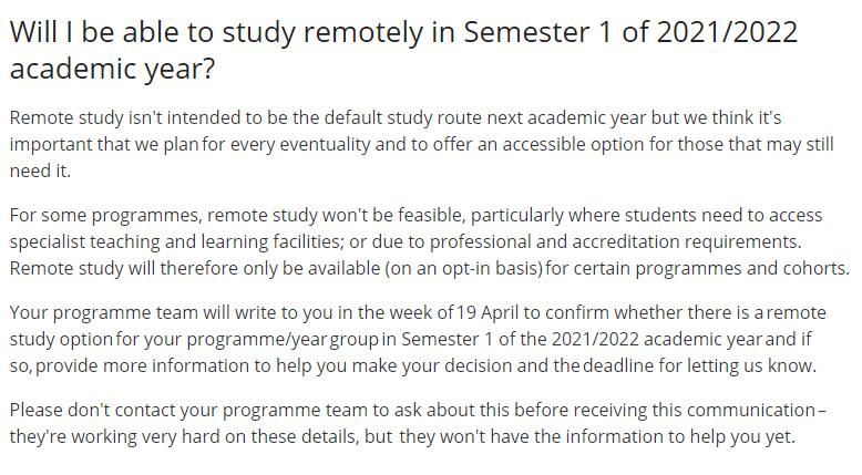 同樣地,按照英國(guó)政府關(guān)于大學(xué)返校的指南,伯明翰大學(xué)目前僅實(shí)踐類課程恢復(fù)線下教學(xué),其他專業(yè)所有學(xué)生本學(xué)年的課程均可以在線進(jìn)行。