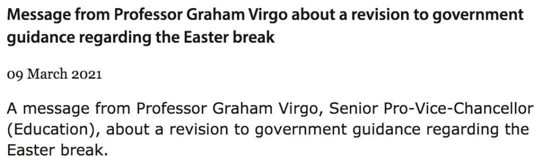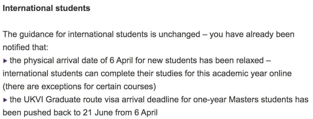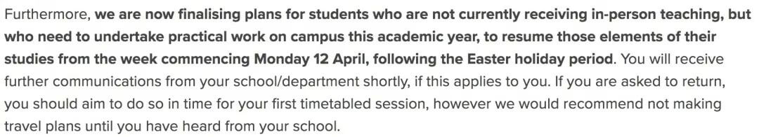 和英國(guó)政府關(guān)于大學(xué)返校指導(dǎo)一致,僅實(shí)踐類課程學(xué)生需返回校園,其他學(xué)生本學(xué)期結(jié)束前繼續(xù)上網(wǎng)課。