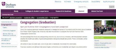 另外,也是受疫情影響,杜倫大學(xué)(Durham)在其官網(wǎng)發(fā)布聲明表示,4月和夏季的畢業(yè)典禮全部延期!