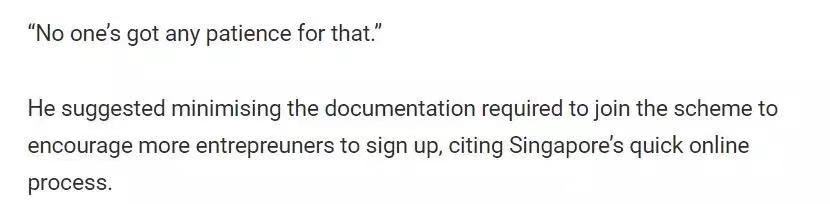 還有人建議盡量減少加入該計(jì)劃所需的文件,以鼓勵更多的企業(yè)家注冊,并引用新加坡的快速加入流程。