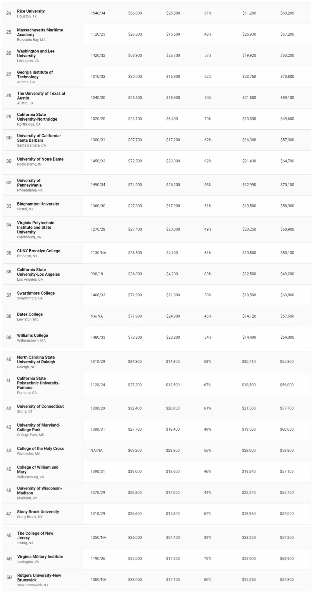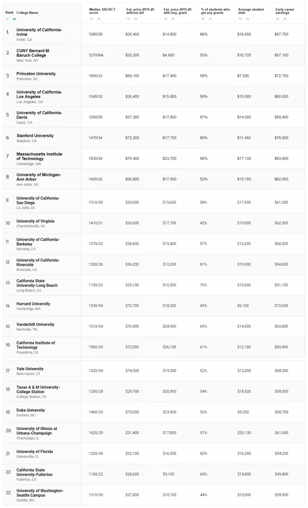 從排名結果來看,加利福尼亞大學爾灣分校被評為全美性價比最高的學校,第二為紐約市立大學柏魯克分校,第三為普林斯頓大學 。
