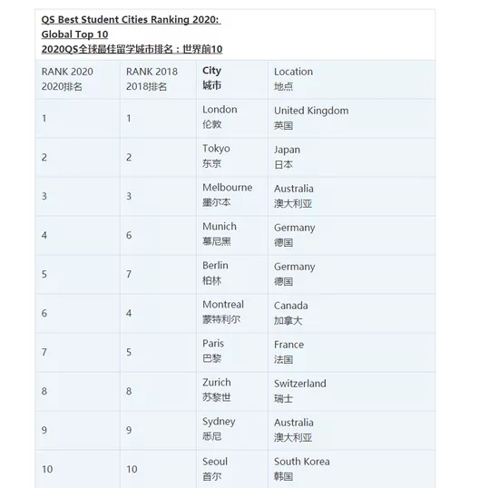 此前,倫敦時(shí)間2019年7月31日,QS全球教育集團(tuán)發(fā)布了最新全球最佳留學(xué)城市排名。