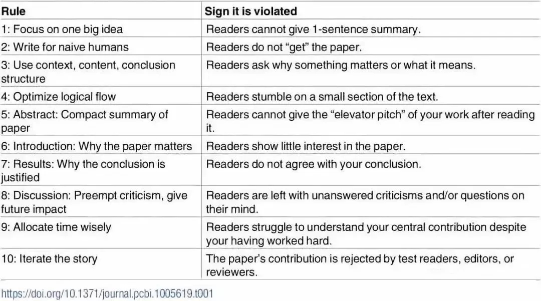作為一個(gè)作者,如果你不能夠在幾分鐘之內(nèi)向你的同事描述出論文的整體大綱,那么很明顯讀者也無法做到。你需要進(jìn)一步提煉你的故事。找尋到此類違反優(yōu)秀寫作的行為對從各個(gè)層次提高論文質(zhì)量十分有益。