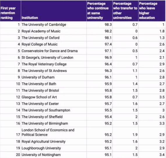 劍橋大學(xué)以98.3%的通過率,成為了全英國通過率最高的大學(xué),榮登榜首。英國皇家音樂學(xué)院和牛津大學(xué)也很優(yōu)秀,通過率分別是98.2%和98.1%。